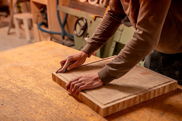Echte Handarbeit aus der Region – nachhaltig und langlebig. Dieses Stirnholz-Schneidebrett vereint rustikale Eleganz mit höchster Funktionalität. Jedes Brett ist ein Unikat, das in vielen einzelnen Produktionsschritten sorgfältig von Hand gefertigt wird – vom präzisen Zuschnitt der Eichenkanteln bis zum finalen Schliff.